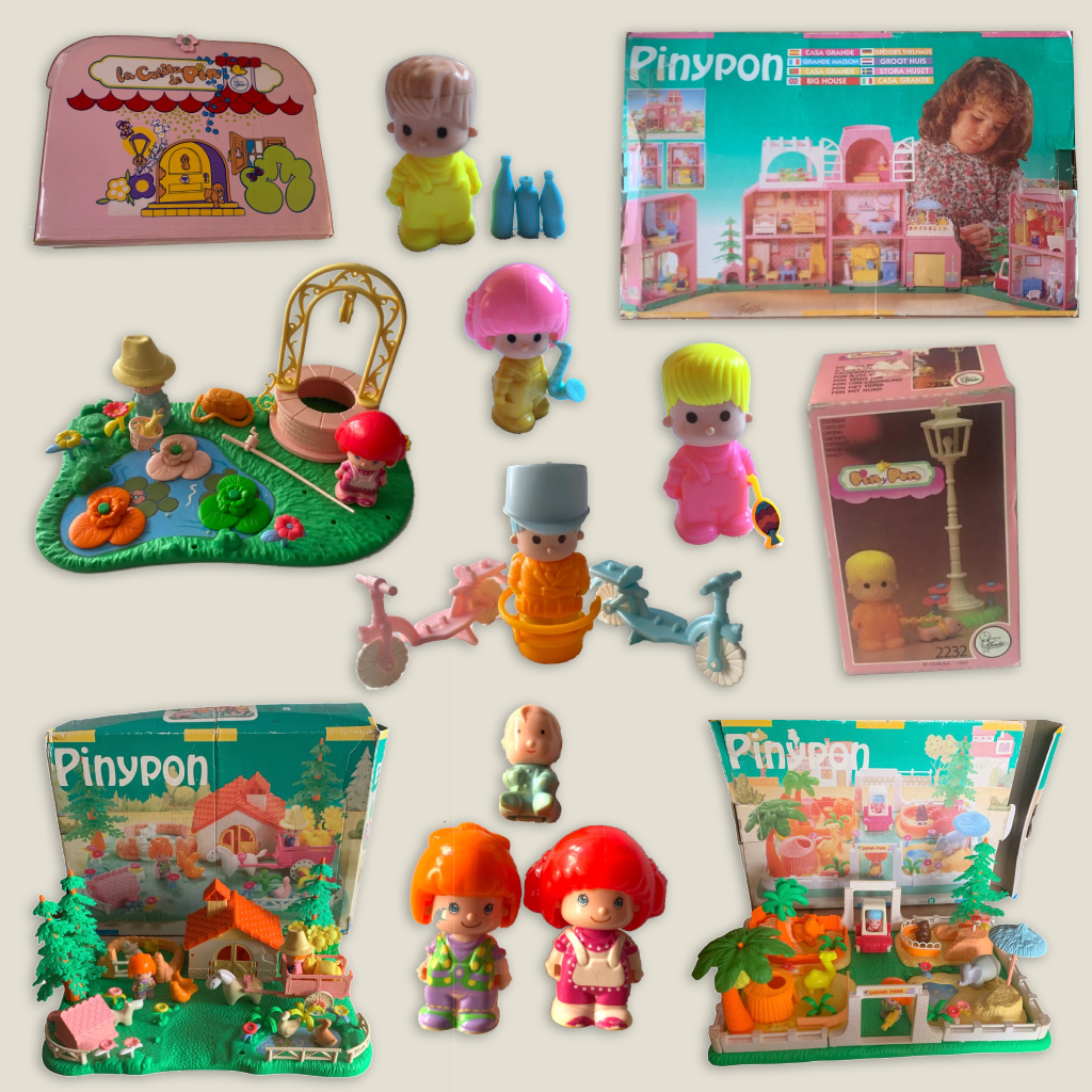– Pinypon: figuras, casas, bicicletas, farolas, pozos y accesorios originales de los años 80, sets completos con su caja y complementos pequeños.
