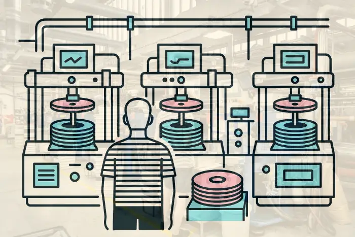 Se realizan escuchas de control y pruebas visuales (alabeo, centrado, ruidos parásitos). Luego se ensobran los discos con su funda interior y se montan las portadas impresas. En grandes plantas europeas, la impresión y el packaging se integran para asegurar consistencia y plazos.