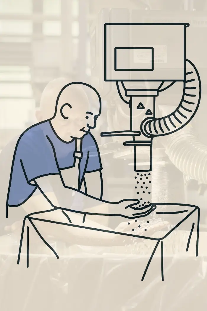 Todo comienza con pequeños gránulos de PVC (cloruro de polivinilo), el material base de los vinilos. Estos gránulos se calientan y se funden hasta formar una masa caliente y maleable en forma de pastilla redonda, conocida como puck o biscuit.