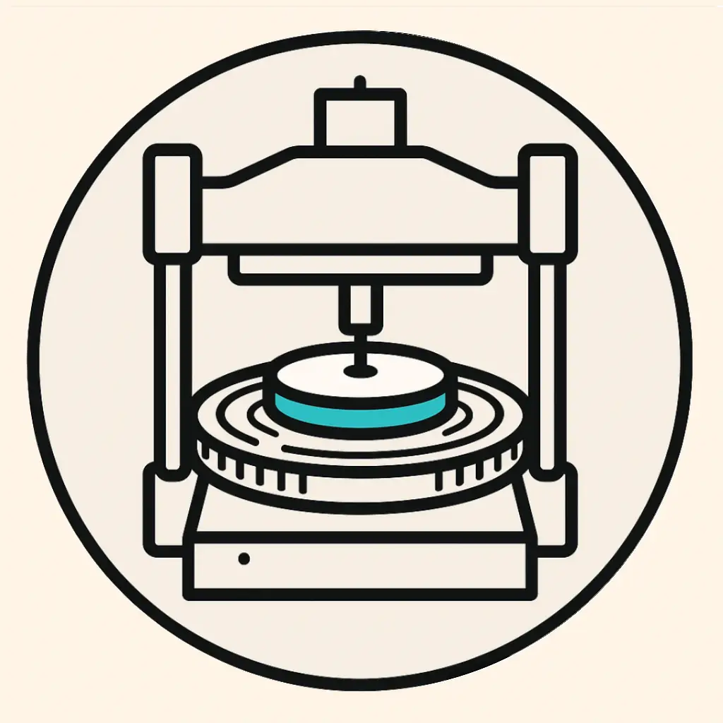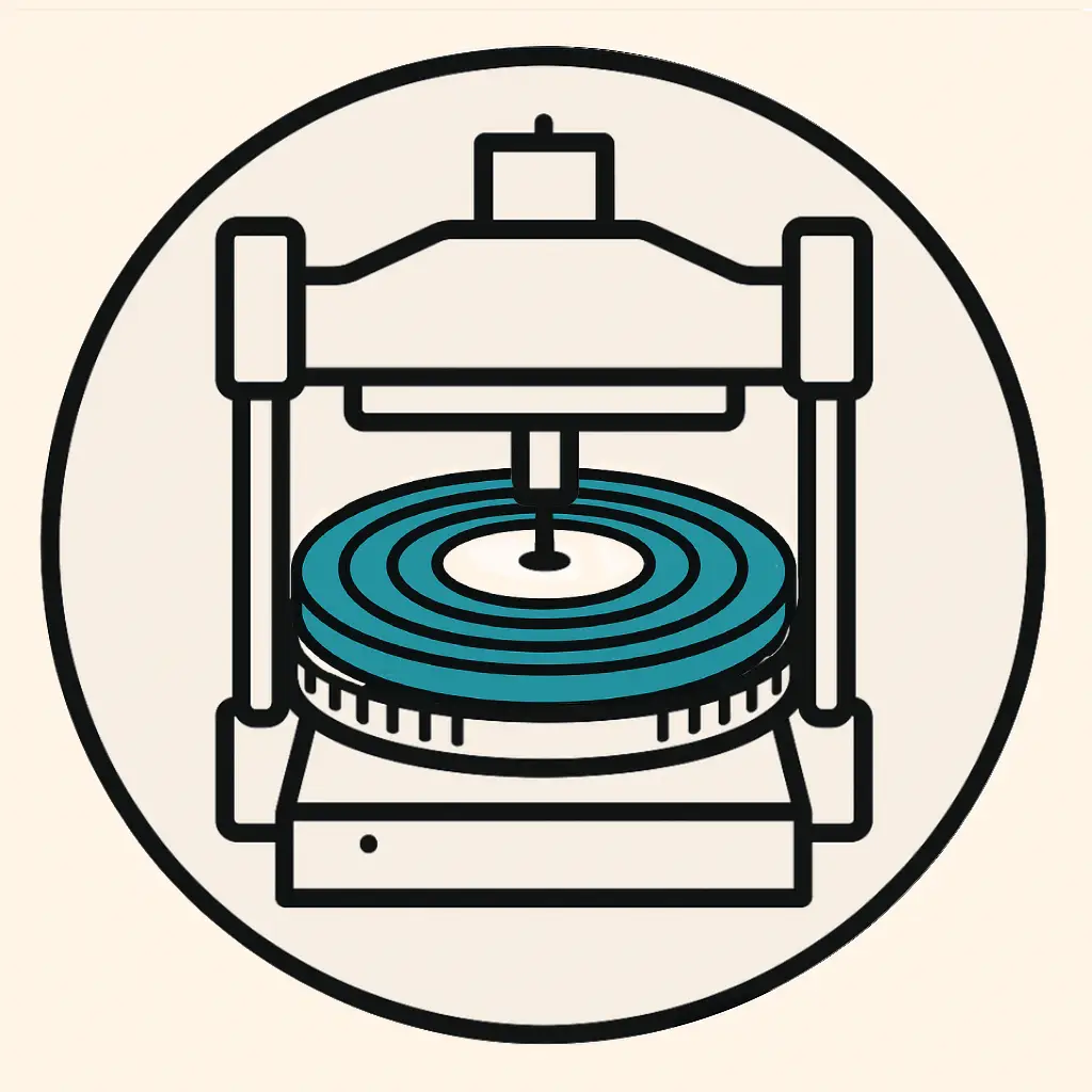 Una vez preparados los stampers, llega el momento más icónico de la fabricación de vinilos: el prensado. Aquí es donde el sonido grabado en el máster se convierte en un disco físico que podremos escuchar en un tocadiscos. Todo comienza con pequeños gránulos de PVC (cloruro de polivinilo), el material base de los vinilos. Estos gránulos se calientan y se funden hasta formar una masa caliente y maleable en forma de pastilla redonda, conocida como puck o biscuit.